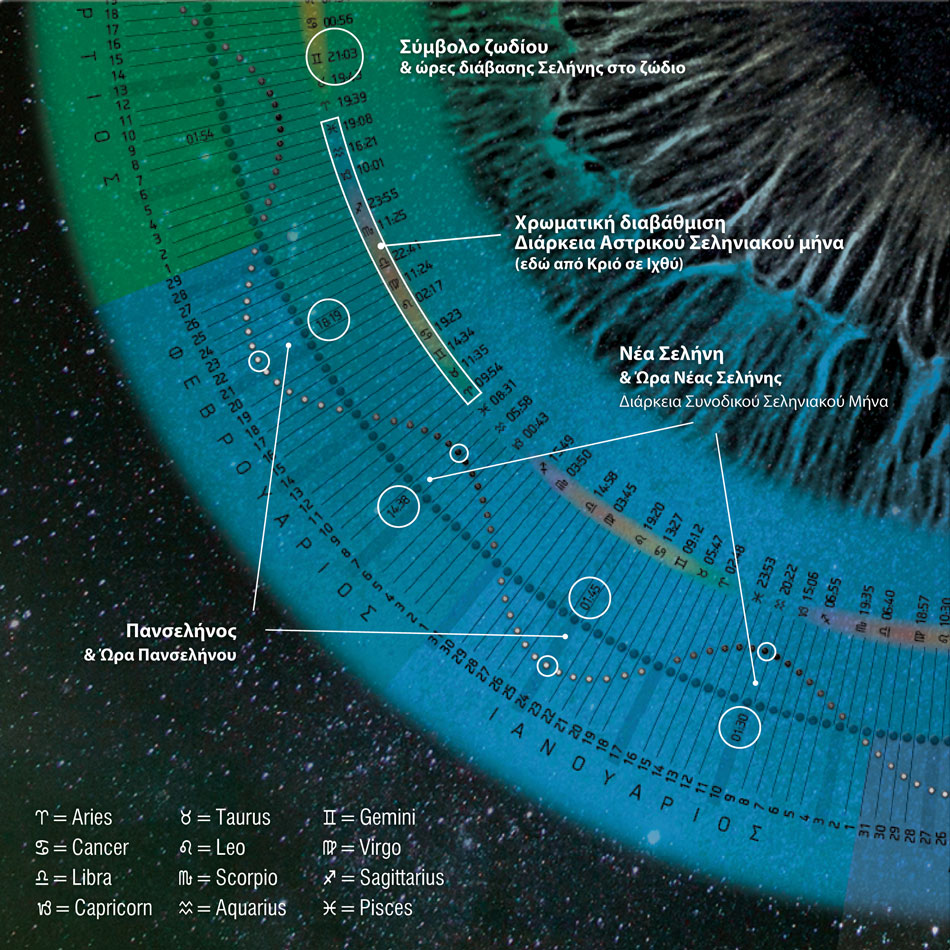 Εσωτερικά από την τροχιά της Γης τα χρώματα των εποχών σβήνουν αρμονικά το ένα μέσα στο άλλο και φιλοξενούνται τα στοιχεία του άλλου κύκλου της Σελήνης, του Αστρικού Σεληνιακού μήνα - ο χρόνος που χρειάζεται για να επανεμφανιστεί η Σελήνη μπροστά από το ίδιο ζώδιο στον ουρανό -. Η διαδοχή των χρωμάτων που εναλλάσσονται κάτω από τα σύμβολα των ζωδίων, - π.χ. από μπλε σε μπλε ή από κίτρινο σε κίτρινο κ.ο.κ.- οπτικοποιεί τη διάρκεια του Αστρικού μήνα της Σελήνης (27,3 ημέρες), του κύκλου της έμμηνου ρήσης, της ανοιχτότητας στη ζωή και τον έρωτα.